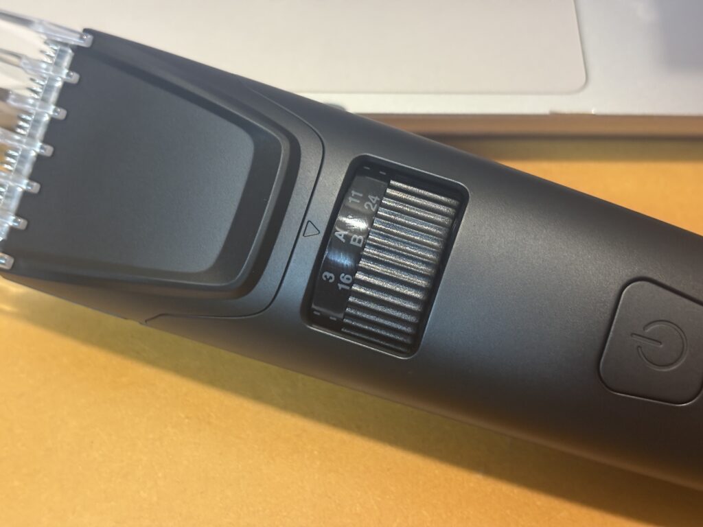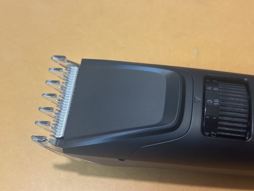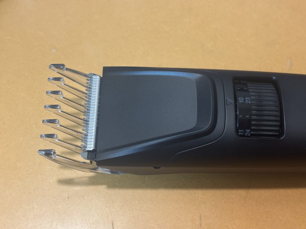 ただし、コームと本体の間に髪の毛が挟まっているとダイヤルの回転が固くなるので、散髪の途中でコームの長さを変える時には、一度コームを外して髪の毛を除去するか洗い流すかしないとうまく変更できません。
