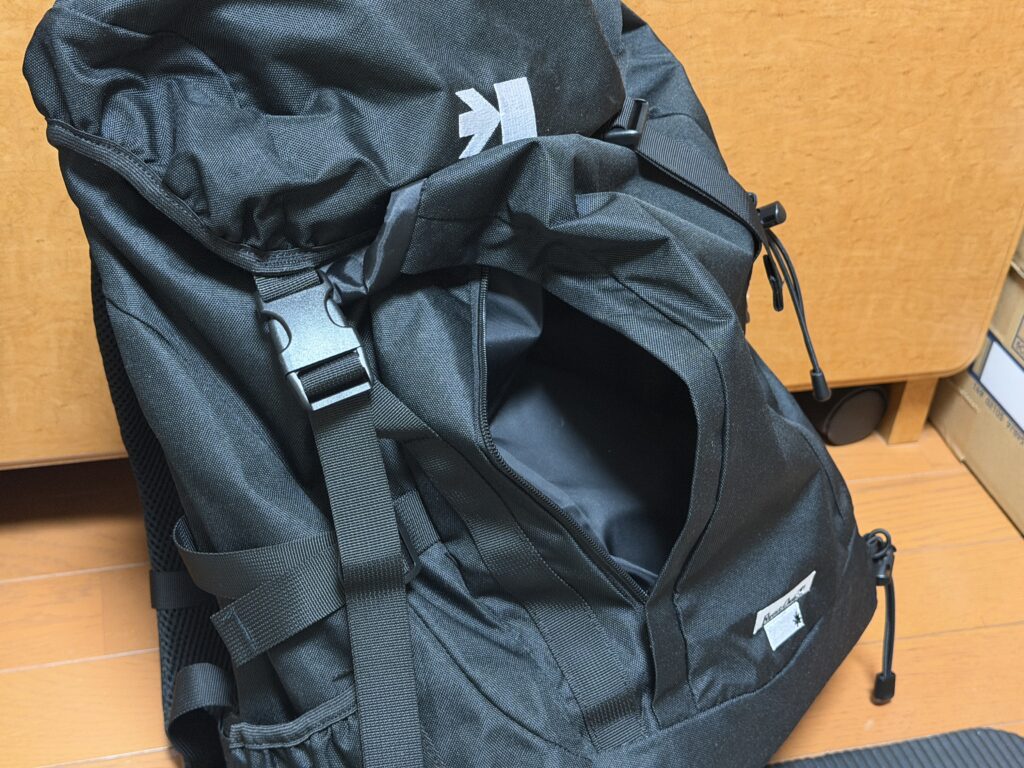 メインポケットの入り口はコードで閉めるタイプなので、開け閉めに一手間掛かります。