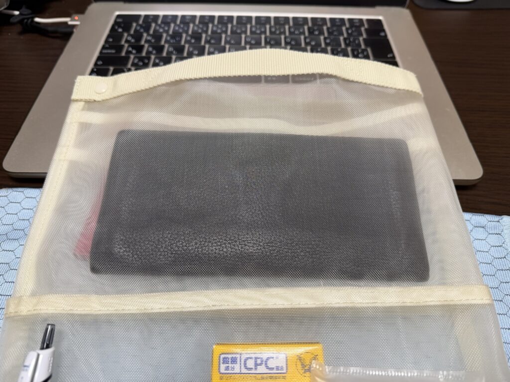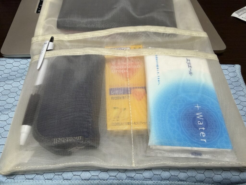 黒色のリュックに入れる用に選んだので、リュックの中で目立つようにアイボリー。