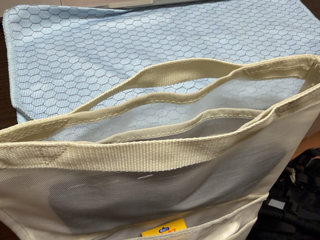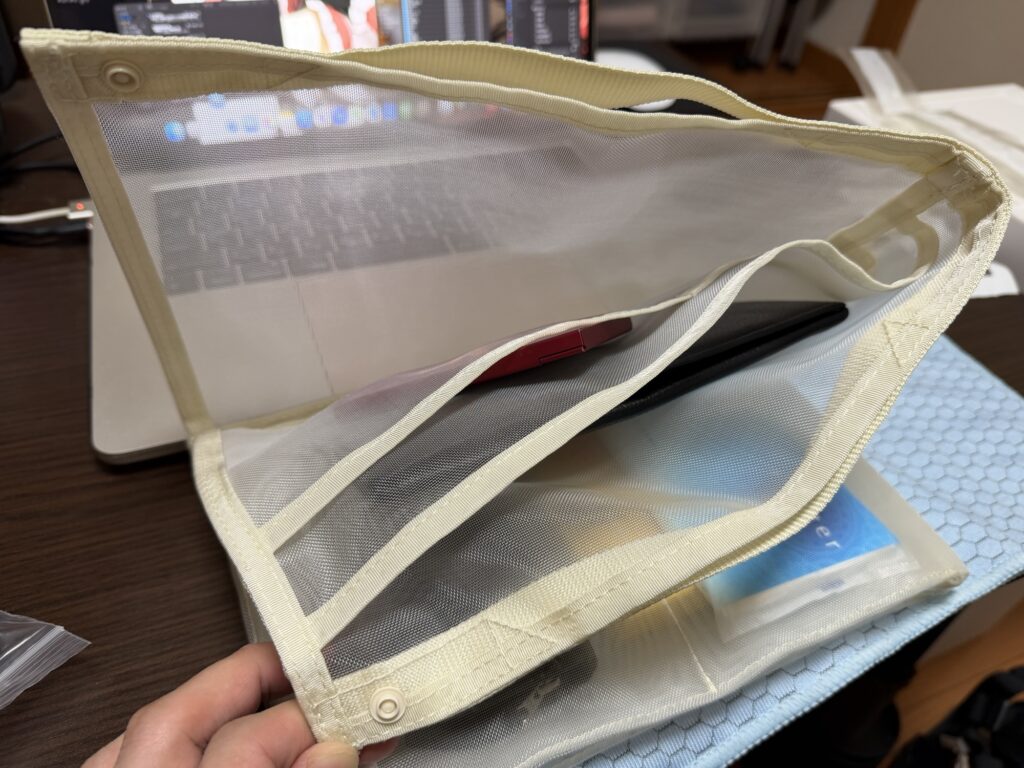 ナイロンメッシュの生地は硬めなので、リュックやバッグの隙間に差し込む際にもスッと入ってくれます。