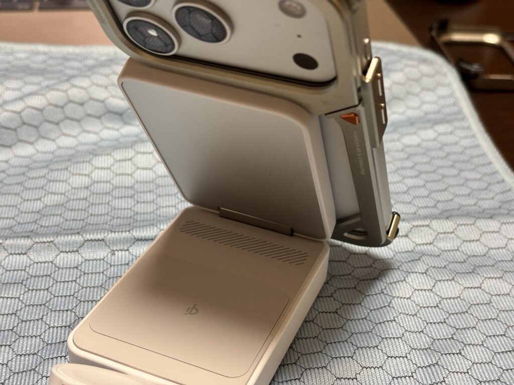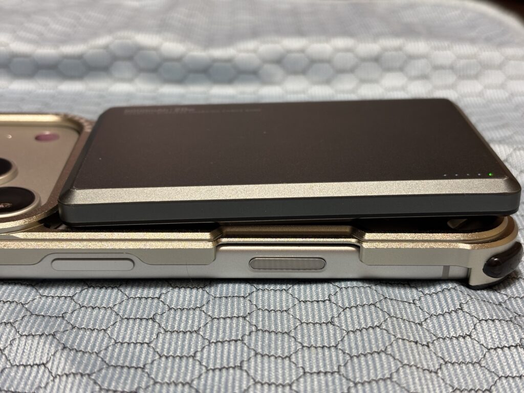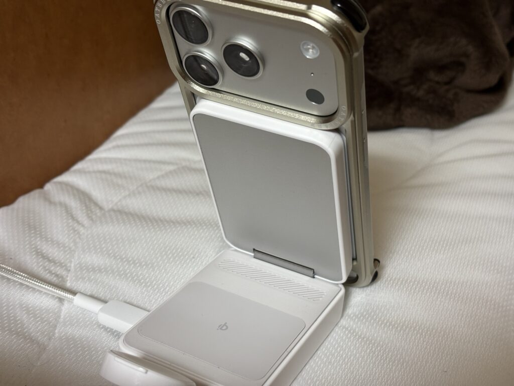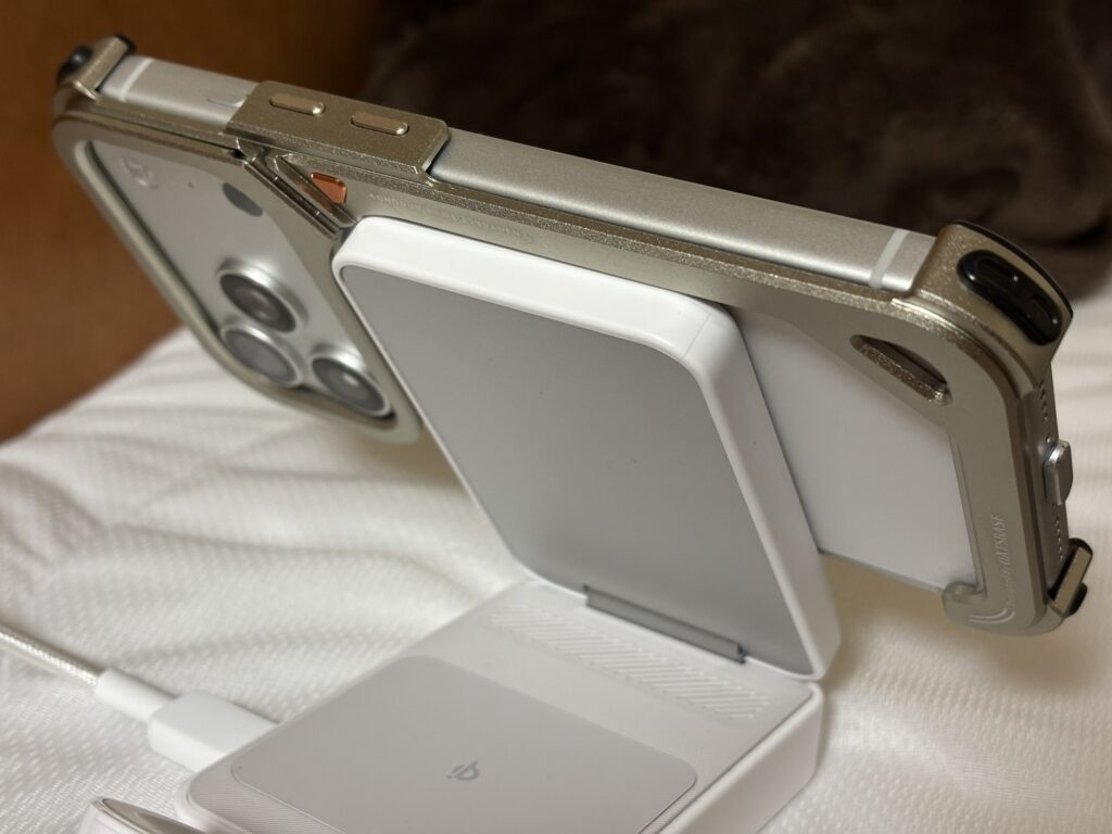 さすがはアンカーの充電器というべきで、強力な磁力でバンパー装着状態のiPhone17proを吸着してくれますし、多少iPhoneとの間に隙間があっても充電されます。