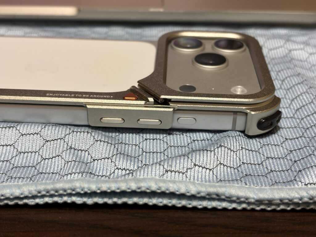 音量ボタンとアクションボタンも剥き出しであるものの、こちらはボタンの半ばまでバンパーフレームで覆われているので、側面の傷に対してのカバー力はそれなりにあります。