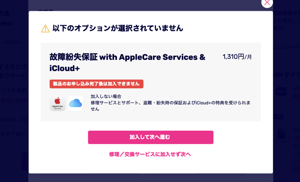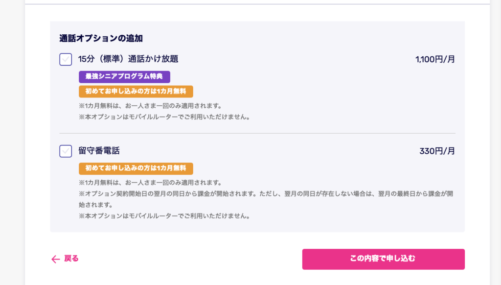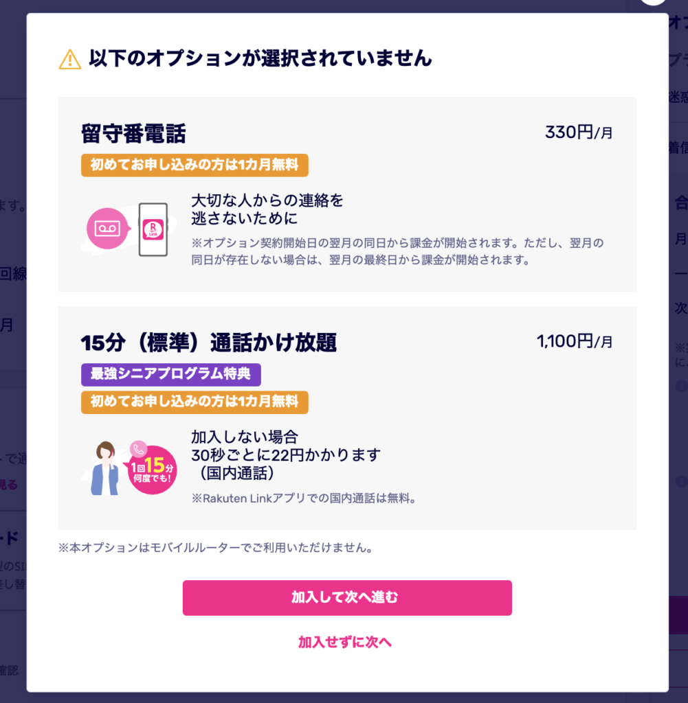 再度オプション未加入の確認画面が出ますが、当然どちらも選択しません。
