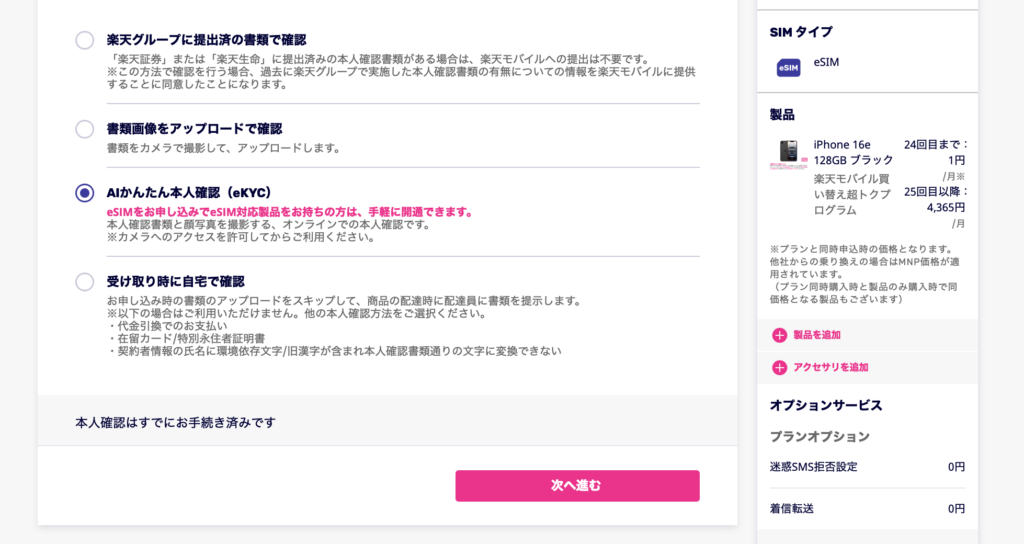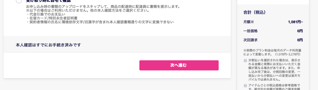 その後、本人確認書類の提出が求められますが、一度でも楽天モバイルを契約していればそのデータが残っているので、ここはすぐに終わります。