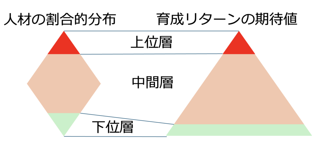 中間層に育成コストをかけるという事は、大人数に業務改善効果や効率上昇効果が及ぼされ、結果的に上位層の負担も軽減されて主力層が分厚くなる可能性が期待できます。